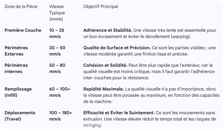 La vitesse ne doit jamais être un paramètre unique appliqué à toute la pièce. Les logiciels de tranchage (slicer) vous permettent d’adapter la vitesse à l’utilité de chaque zone.