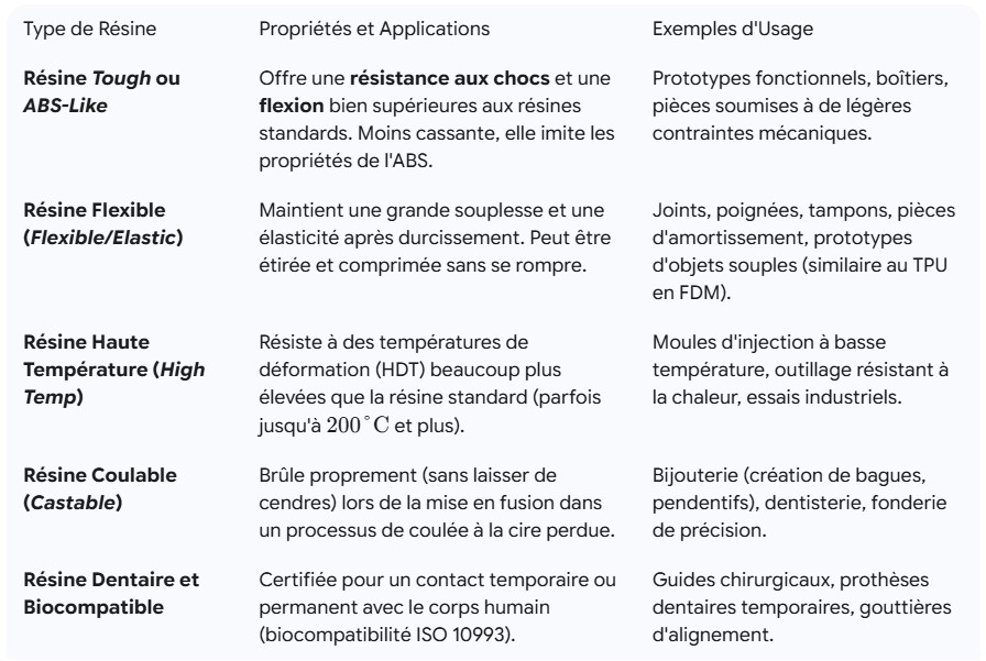 Ces résines sont conçues pour des applications spécifiques nécessitant des propriétés mécaniques ou chimiques particulières. Elles sont généralement plus chères mais offrent des performances accrues.
