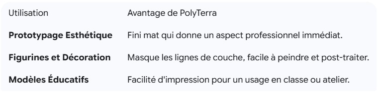 L’avantage le plus visible est sa finition ultra-mate. Contrairement aux filaments brillants qui accentuent les lignes de couche, la texture mate de PolyTerra masque efficacement les défauts et les couches d’impression. Il donne un aspect brut, minéral, très prisé pour :